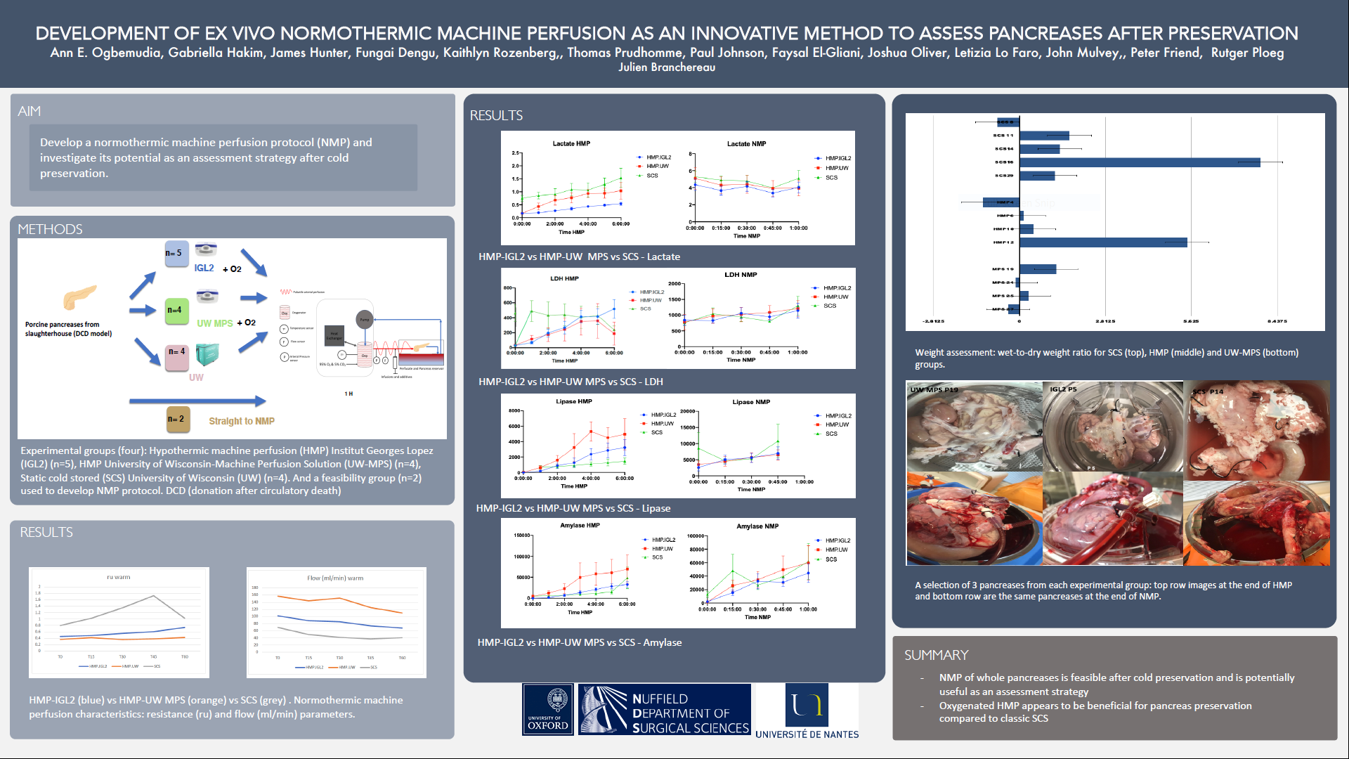 8 porcine pancreases were procured in conditions replicating donation after circulatory death with warm ischaemia time of 25 minutes. After 3 hours of static cold storage (SCS) the pancreases were divided into 3 experimental groups 1) the feasibility group (n=2) that underwent 2.5 hours of NMP 2) the SCS group (n = 2) that underwent an additional 6 hours of SCS prior to assessment on NMP for an hour and 3) the Oxygenated Hypothermic Machine Perfusion (oxyHMP) group (n = 4) that underwent 6 hours of oxyHMP followed by 1-hour assessment on NMP. The NMP protocol used autologous, leucodepleted blood delivered at a mean arterial pressure of 40mmHg with a temperature of 37oC. At timed intervals during NMP, perfusate samples were collected for gas analysis and perfusion parameters were recorded.