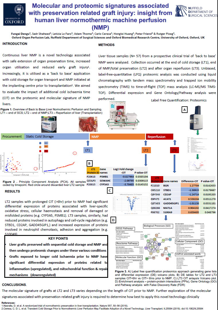 Continuous liver NMP is a novel technology associated with safe extension of organ preservation time, increased organ utilisation and reduced early graft injury1. Increasingly, it is utilised as a ‘back to base’ application with cold storage for organ transport and NMP initiated at the implanting centre prior to transplantation2. We aimed to evaluate the impact of additional cold ischaemia time (CIT) on the proteomic and molecular signature of NMP livers.
