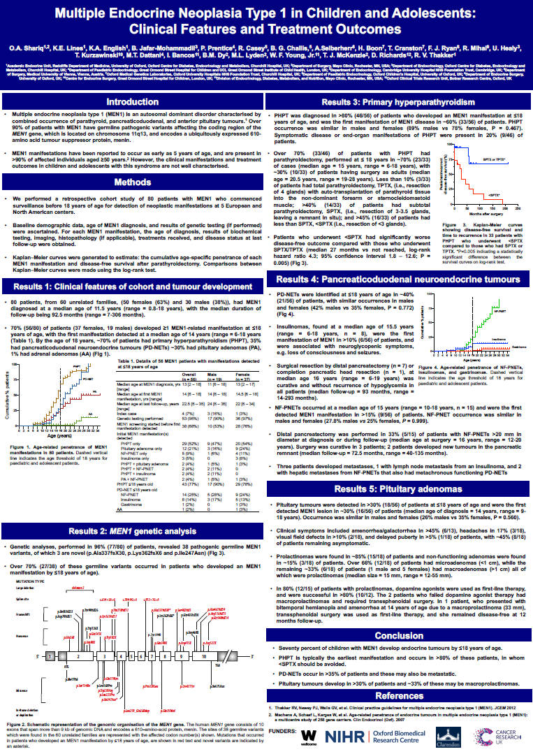 Eighty MEN1 patients who underwent childhood/adolescent tumour surveillance at 5 international referral centres were included. Fisher’s exact, Wilcoxon rank-sum and Kaplan-Meier tests were used to compare proportions, continuous variables and recurrence-free survival, respectively.